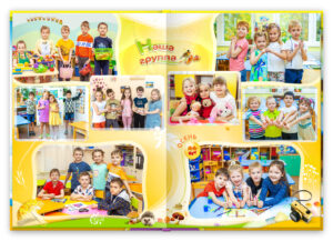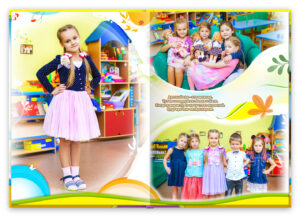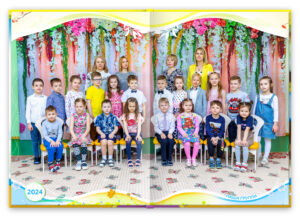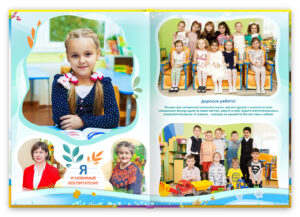- Персональный разворот каждого ребенка, с крупным портретом и репортажными фотографиями